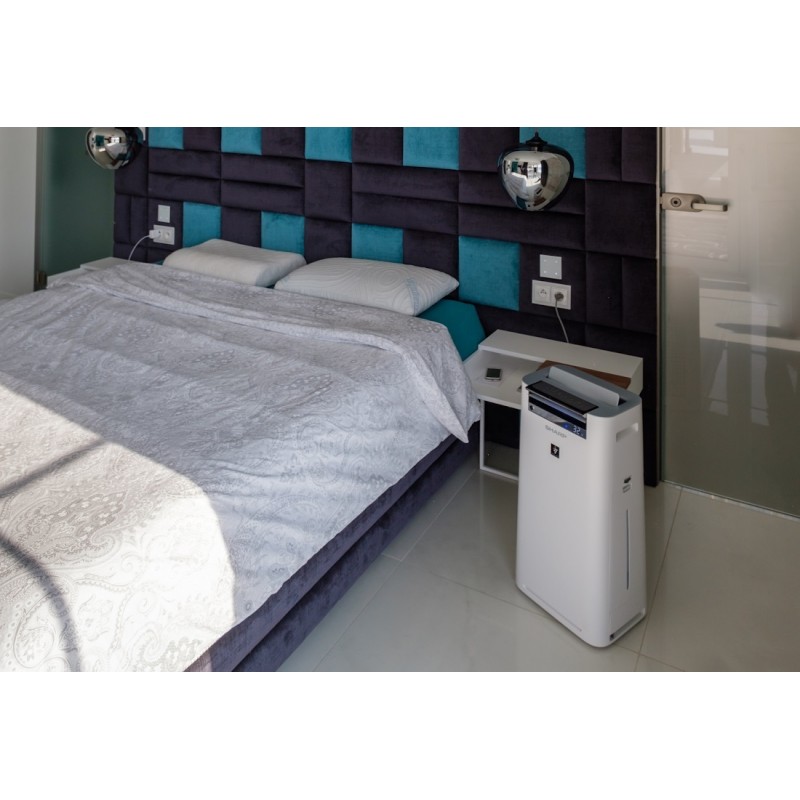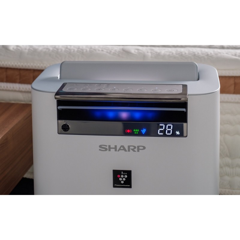 Звичайно, є і зволожуючий фільтр, який затримує осад та мікроорганізми, що містяться у воді. В останній серії він був покращений, має більшу механічну міцність і може промиватися під струменем води. Sharp KC-G50EUW зволожує повітря за допомогою технології випаровування. Завдяки функції зволоження пристрій постійно контролює температуру та відносну вологість повітря та виділяє достатню кількість водяної пари, щоб постійно підтримувати рівень вологості на оптимальному рівні, що становить від 40 до 60% та залежить від температури навколишнього середовища.