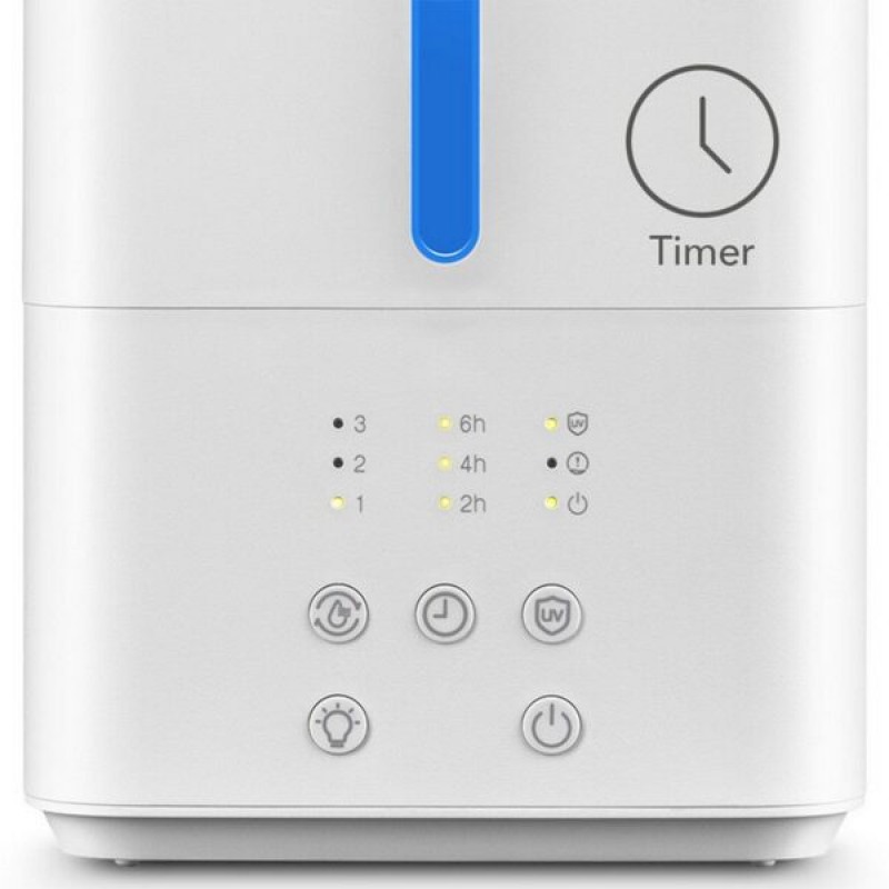 І ось як це працює: Головною деталлю цього зволожувача є спосіб наповнення водою – воду заливаємо прямо зверху, просто знявши верхню кришку, що значно спрощує експлуатацію та обслуговування. Ультразвук перетворює водопровідну воду, заповнену в резервуар для води 4,2 л, освіжаючий аерозольний туман, який розподіляється по кімнаті за допомогою розпилювальної насадки. Три регульовані рівні розпилення (макс. 250 мл/год) забезпечують безперервне зволоження до 16 годин.