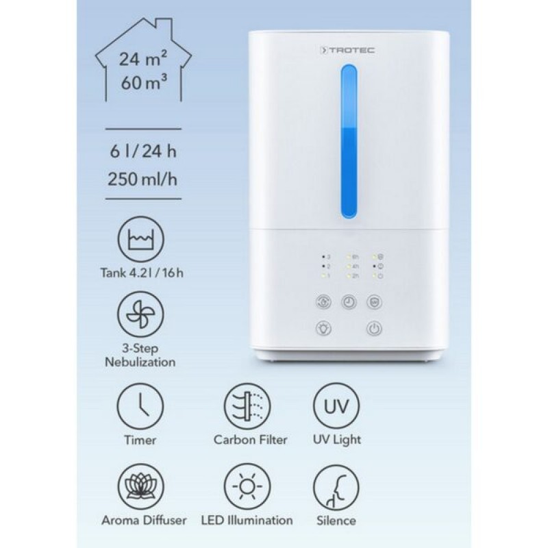 Зволожувач повітря серії TROTEC – це не тільки вінець простоти у використанні, але й багатофункціональний прилад, що поєднує декілька функцій.