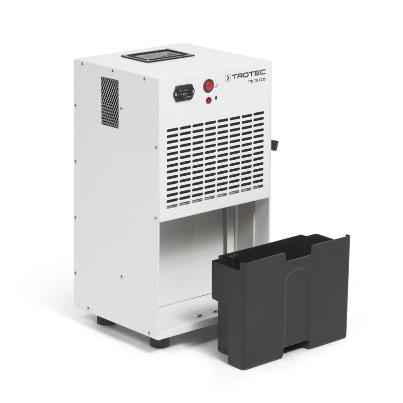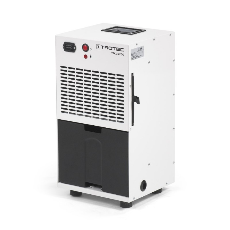 Осушувач TTK 75 ECO після установки просто вмикається, і відразу починає осушувати повітря. Він виводить значну кількість вологи з повітря в приміщенні, і завдяки автоматичному розморожуванню гарячого газу досягає високих результатів навіть за низьких температур у неопалюваних приміщеннях. Завдяки зовнішньому зливу конденсату та доступному насосу для конденсату, TTK 75 ECO також ідеально підходить для тривалішої експлуатації без нагляду за його роботою. Функціональність приладу може бути визначена за допомогою вбудованого лічильника робочого часу. Це робить TTK 75 ECO одним із найкращих варіантів для комерційного застосування.