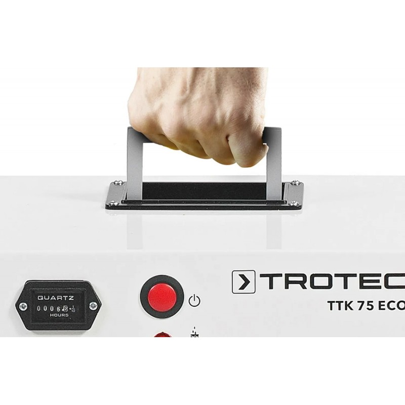 TTK 75 ECO - один з найлегших пристроїв від компанії Trotec серії TTK-ECO, оснащений кабельними тримачами і висувною металевою ручкою для перенесення, тому його можна зручно транспортувати на місце експлуатації. Завдяки ефективному роторно-поршневому компресору пристрій характеризується низьким рівнем обслуговування, і його можна використовувати в будь-якому положенні.