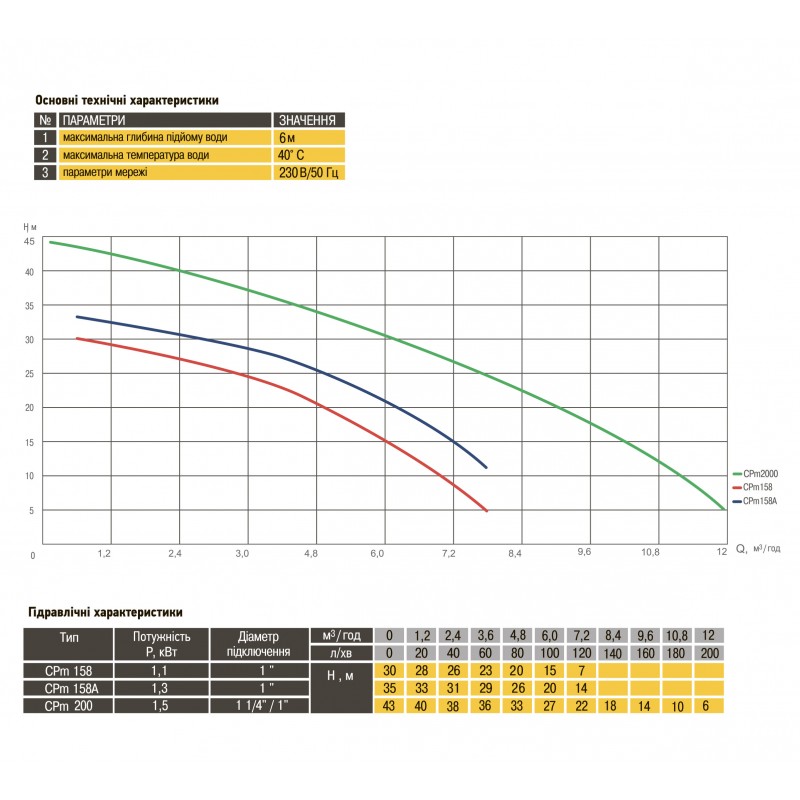 Технічні характеристики: • номінальна потужність двигуна - 1,3 кВт • необхідна напруга - 220В ± 5%, 50Гц • максимальна температура й рідини 40 ° С • максимальна глибина всмоктування - 3 м • максимальна висота напору -43 м • максимальна продуктивність -6 м3 / год (100 л / хв) • максимальна температура води - 40 * С • вага в упаковці - 12.66 кг • діаметр підключення - 1 ″ • вага насоса - 12.1 кг • габарити упаковки (ВхШхГ) - 38х24х23 см Завдяки надійності, простоті в експлуатації і економічності, цей насос знайшов своє застосування в багатьох сферах діяльності.