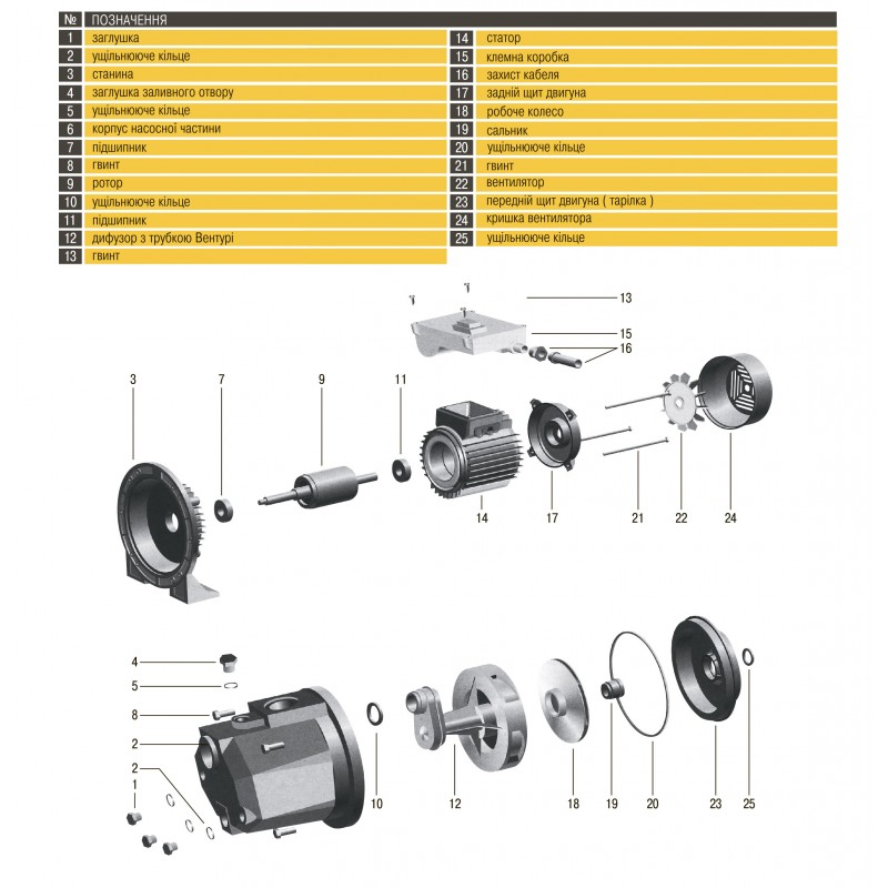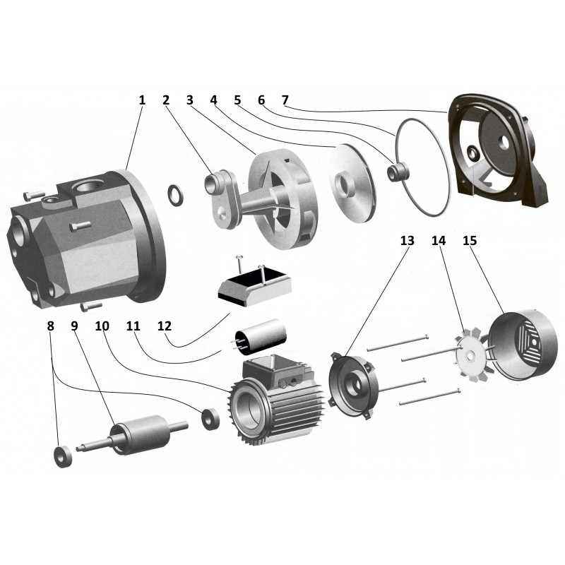 Конструктивні особливості: • Насосна частина виготовлена з чавуну • Робоче колесо - латунь • Дифузор і ежектор - термопласт, • Вал ротора - нержавіюча сталь. • Механічне ущільнення - кераміка і графіт. • Корпус електродвигуна охолоджується вентилятором. • Опори вала ротора - шарикопідшипники, вільно доступні для обслуговування. • Ступінь захисту двигуна IP44. • Клас ізоляції F. Напруга мережі: 230V-50Hz. • Термозахисне реле вбудоване в двигун