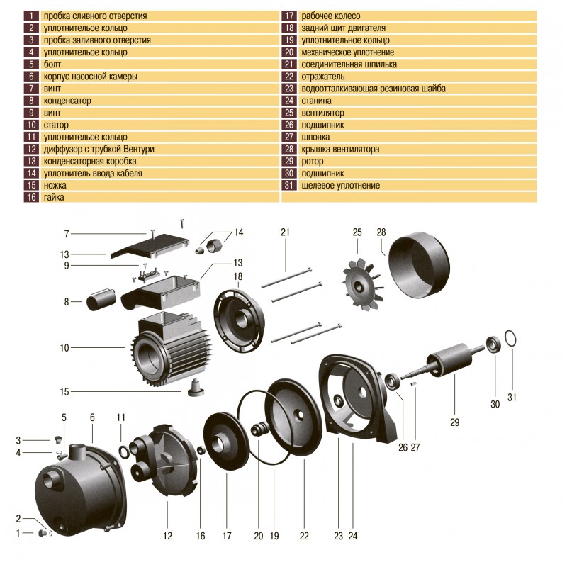 Конструктивні особливості: • Матеріал корпусу - нержавіюча сталь • Робоче колесо - технополімер • Дифузор і ежектор - термопласт, • Вал ротора - нержавіюча стали. • Механічне ущільнення - кераміка і графіт. • Корпус електродвигуна охолоджується вентилятором. • Опори вала ротора - шарикопідшипники, вільно доступні для обслуговування. • Ступінь захисту двигуна IP44. • Клас ізоляції F. Напруга мережі: 230V-50Hz. • Термозахисне реле вбудоване в двигун