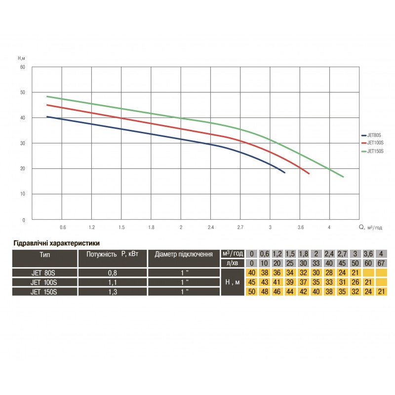 Технічні характеристики: • номінальна потужність двигуна - 0,8 кВт • необхідна напруга - 220В ± 5%, 50Гц • максимальна глибина всмоктування -9 м • максимальна висота напору - 40 м • максимальна продуктивність - 3 м3 / год (50 л / хв) • максимальна температура води - 40 * С • діаметр підключення - 1 ″ • вага в упаковці - 10 кг • вага насоса - 9.18 кг • габарити в упаковці (ВхШхГ) - 40х25х22 см
