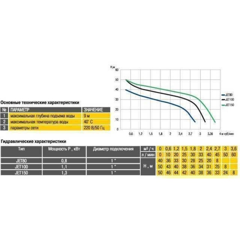 Технічні характеристики: • номінальна потужність двигуна - 1,1 кВт • необхідне напруга - 220В ± 5%, 50Гц • максимальна глибина всмоктування -9 м • максимальна висота напору - 50 м • максимальна продуктивність - 3 м3 / год (50 л / хв) • максимальна температура води -40 * С • діаметр підключення - 1 ″ • вага в упаковці - 12.21 кг • вага насоса - 11.67 кг • габарити упаковки (ВхШхГ) - 44х22х19 см