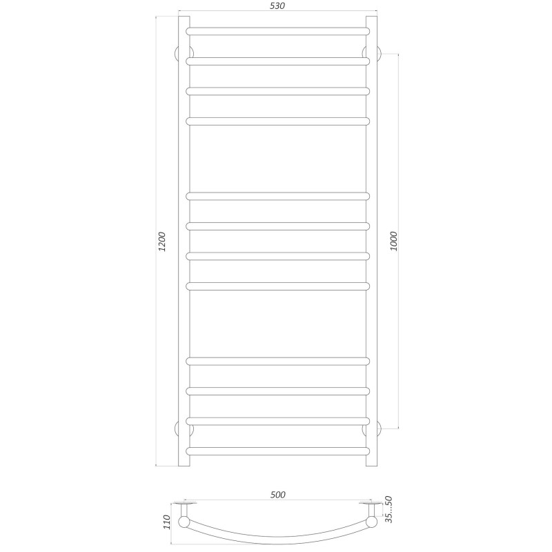 Характеристики: Матеріал - нержавіюча сталь Висота - 1200 мм Ширина - 500 мм Кількість перемичок - 12 Вивід шнура живлення - EL - Лівий / ER - Правий Живлення - 220 В / 50 Гц Потужність - 230 Вт Ступень захисту - ІР44 Температура зовнішньої поверні виробу - 50 ± 10 °С
