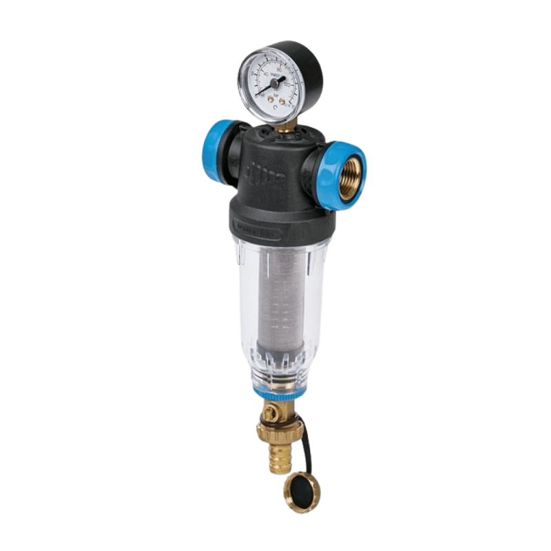 Самопромивний фільтр 2P SAN з конекторами ½" та ¾" з картриджем з сіткою з нержавіючої сталі AISI 304 (2P-PET-SAN)