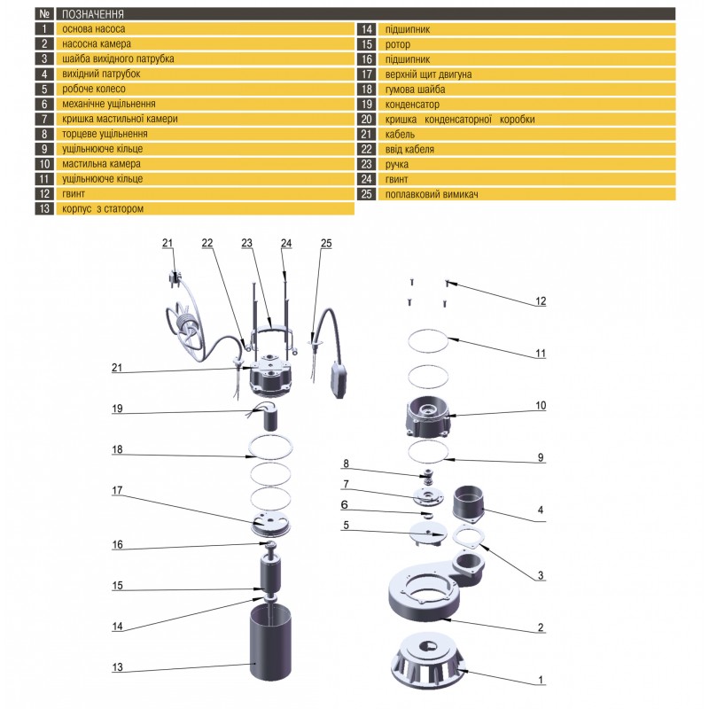 Конструктивні особливості: Корпус насосної частини і робоче колесо виготовлено з чавуну. Надійність елементів ущільнювачів фекального насоса повністю ізолює електродвигун від контакту з рідиною, що перекачується і захищає від надлишкових тепла і вологи. Наявність таких особливостей, як подвійне торцеве ущільнення валу в маслозаповненій камері і маслозаповненому двигуні гарантують охолодження насоса навіть у разі його занурення в рідину менш ніж на половину. Також насос обладнаний поплавковим вимикачем , що забезпечує роботу насоса в автоматичному режимі. Напруга мережі: 230V - 50Hz