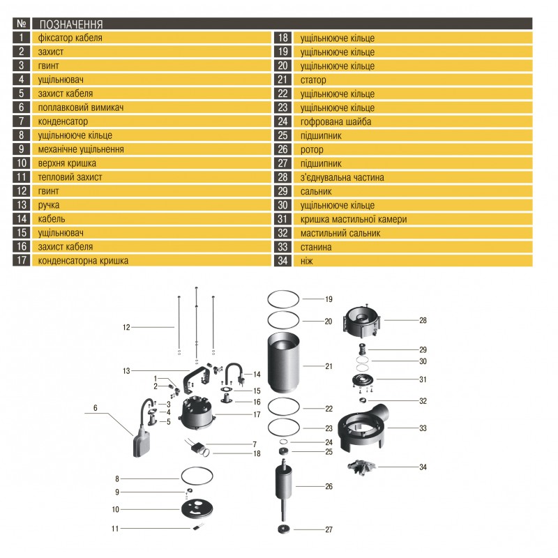 Конструктивні особливості: Корпус насосної частини і робоче колесо виготовлено з чавуну. Надійність елементів ущільнювачів фекального насоса повністю ізолює електродвигун від контакту з рідиною, що перекачується і захищає від надлишкових тепла і вологи. Наявність таких особливостей, як подвійне торцеве ущільнення валу в маслозполненной камері і маслозаповнений двигун, гарантують охолодження насоса навіть у разі його занурення в рідину менш ніж на половину. Робоче колесо з ріжучим механізмом дозволяє подрібнювати різноманітні відходи, які транспортуються зі стічними водами-шматки тканини, шнури і ін. Також насос обладнаний поплавковим вимикачем, що забезпечує роботу насоса в автоматичному режимі. Напруга мережі: 230V - 50Hz. Термозахисне реле вбудоване у виносний блок.