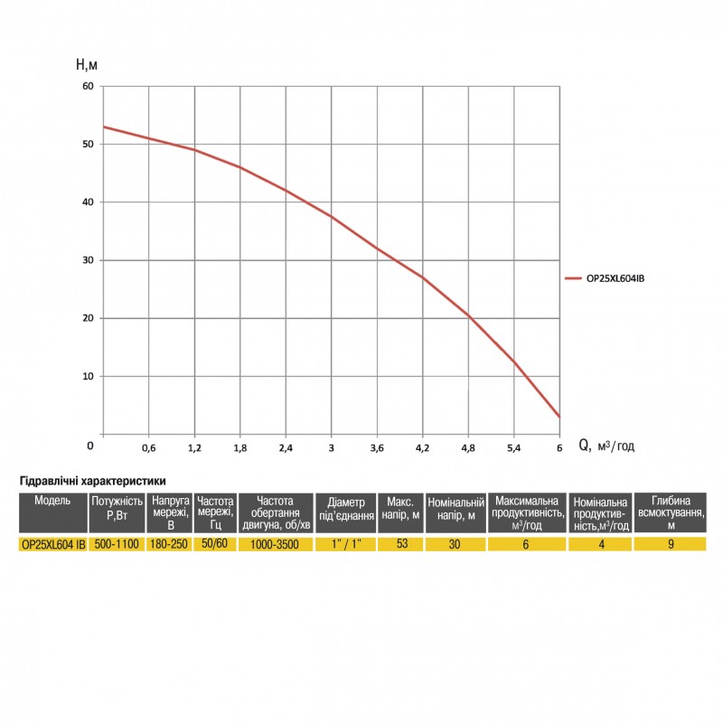 Потужність - 500-1100 Вт Напруга - 180-250 В Частота мережі - 50 Гц Швидкість обертання двигуна - 1000-3500 об/хв Діаметр різьби на вході/виході - 25 ( 1″ ) Максимальний напір - 53 м Номінальний напір - 30 м Максимальна продуктивність - 6 м3/год Номінальна продуктивність - 4 м3/год Глибина всмоктування - 9 м