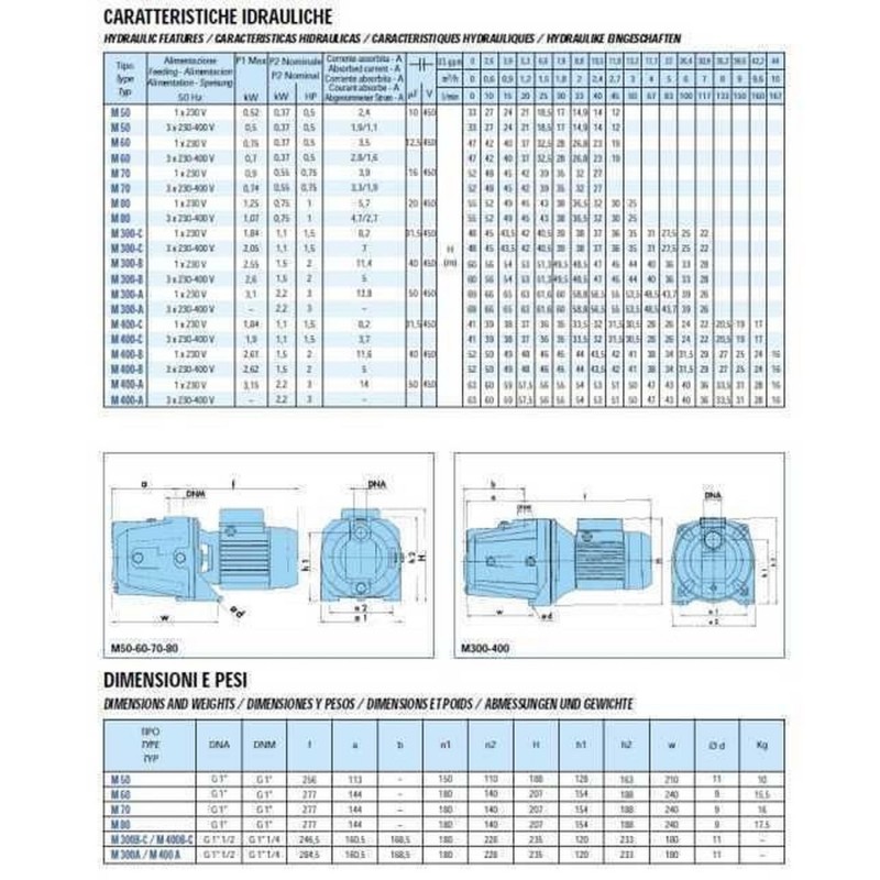 Конструктивні характеристики. • Корпус насоса виготовлений з нержавіючої сталі AISI 304. • Робоче колесо -з латуні. • Дифузор - з технополімера • Ротор - нержавіюча сталь. • Механічне ущільнення - з кераміки і графіту. • Корпус двигуна - з дюралі • Корпус двигуна охолоджується вентилятором • Електродвигун закритого типу з примусовим охолодженням (TEFC), придатний для безперервної роботи. • Опори вала ротора - кульові підшипники, вільно доступні для обслуговування • Однофазні двигуни забезпечені робочим конденсатором, за запитом обмотки двигуна забезпечуються термозахистом • Ступінь захисту IP44 (за запитом IP55). • Клас ізоляції F. • Всмоктуючий і напірний патрубок - різьбові. • Напруга: 230V-50Hz