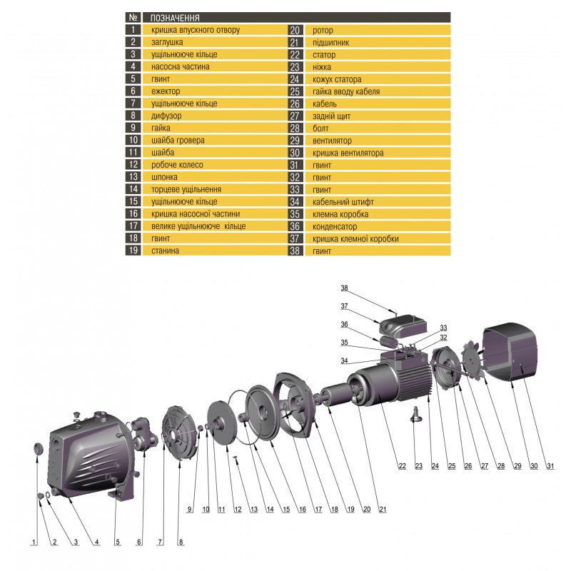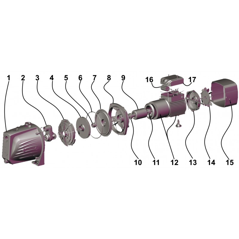 Конструктивні особливості: • Насосна частина виготовлена з чавуну • Робоче колесо - термопласт • Дифузор і ежектор - термопласт, • Вал ротора - нержавіюча сталь. • Механічне ущільнення - кераміка і графіт. • Корпус електродвигуна охолоджується вентилятором. • Опори вала ротора - шарикопідшипники, вільно доступні для обслуговування. • Ступінь захисту двигуна IP44. • Клас ізоляції F. • Напруга мережі: 230V-50Hz. • Термозахисне реле вбудоване в двигун