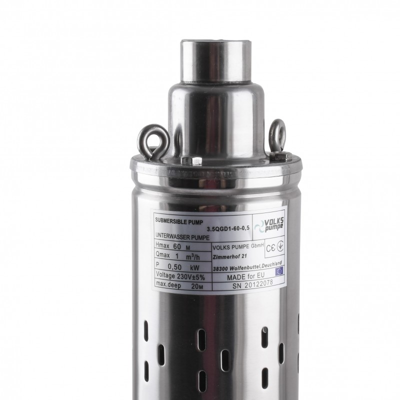 Технічні характеристики: • Максимальний вміст мулу: 150 г / м³ • Температура рідини до 40 ° С • Максимальної натиск - 60 м • Максимальна продуктивність - 1,0 м3 • Потужність - 0,5 кВт • Максимальний робочий тиск: 10 бар • Корпус насоса: нержавіюча сталь • Максимальна глибина занурення: 20 м • Діаметр вихідного патрубка: 1 • Максимальний діаметр: 88 мм (3,5 QGD • Робочий діапазон температури води: від 1 ° С до 40 ° С • Глибина занурення від поверхні води від 0,5 до 20 м • Напруга мережі: 220 В 50 Гц