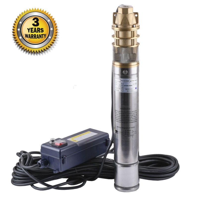 Насос свердловинний вихровий Optima 3SKm100 PRIME 0.75кВт + кабель 15м і пульт Насос Насос свердловинний вихровий VOLKS pumpe 3SKm100 0.75кВт призначений для підйому води з глибоких свердловин, колодязів і будь-яких інших джерел, для водопостачання житлових будинків, котеджів. Насос може використовуватися разом з баком для автоматичного водопостачання. Конструкція і принцип дії. Насос Optima 3SKm100 PRIME 0.75кВт складається з однофазного електродвигуна з масляним охолодженням, призначеного для роботи під водою і насосної частини з 3-ма робочими колесами вихрового типу. Вихідний фланець, опора наосонної частини насоса та масляна камера виконані з латуні. Використані підшипники C&U. Гвинти із нержавіючої сталі AISI 304 Включення і відключення насоса і його підключення до електромережі здійснюється за допомогою блоку управління.
