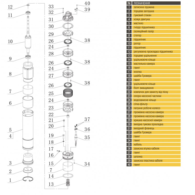 Комплектуючі: 1. Насос 2. Блок управління 3. Кабель 20м 4. Гарантійний талон
