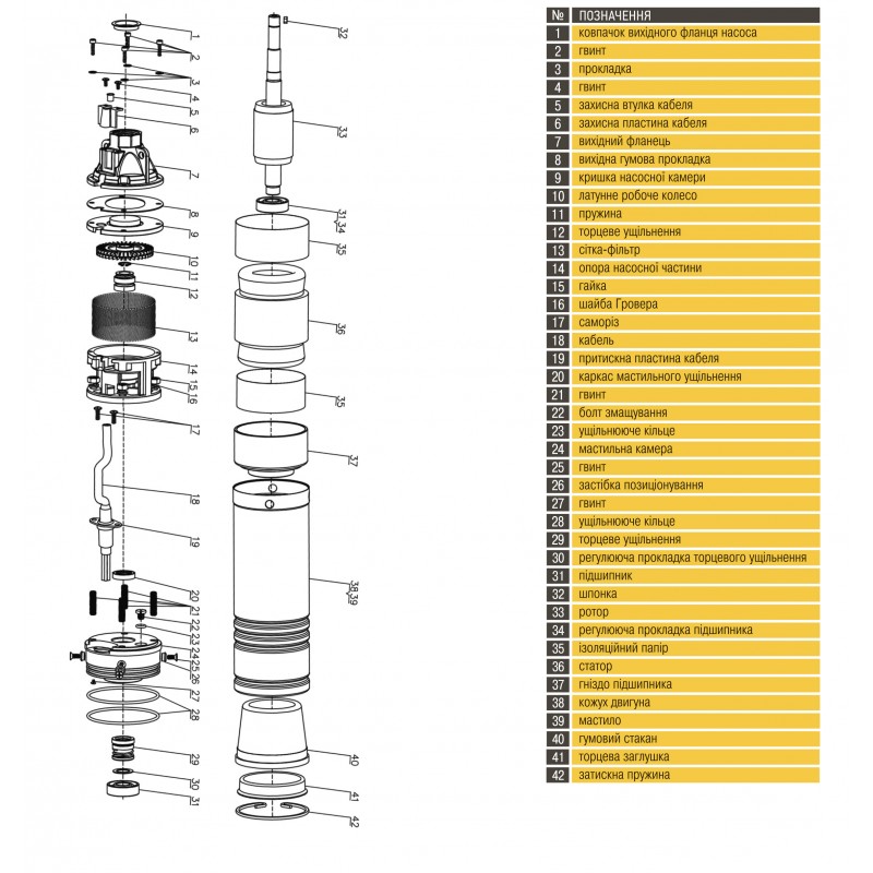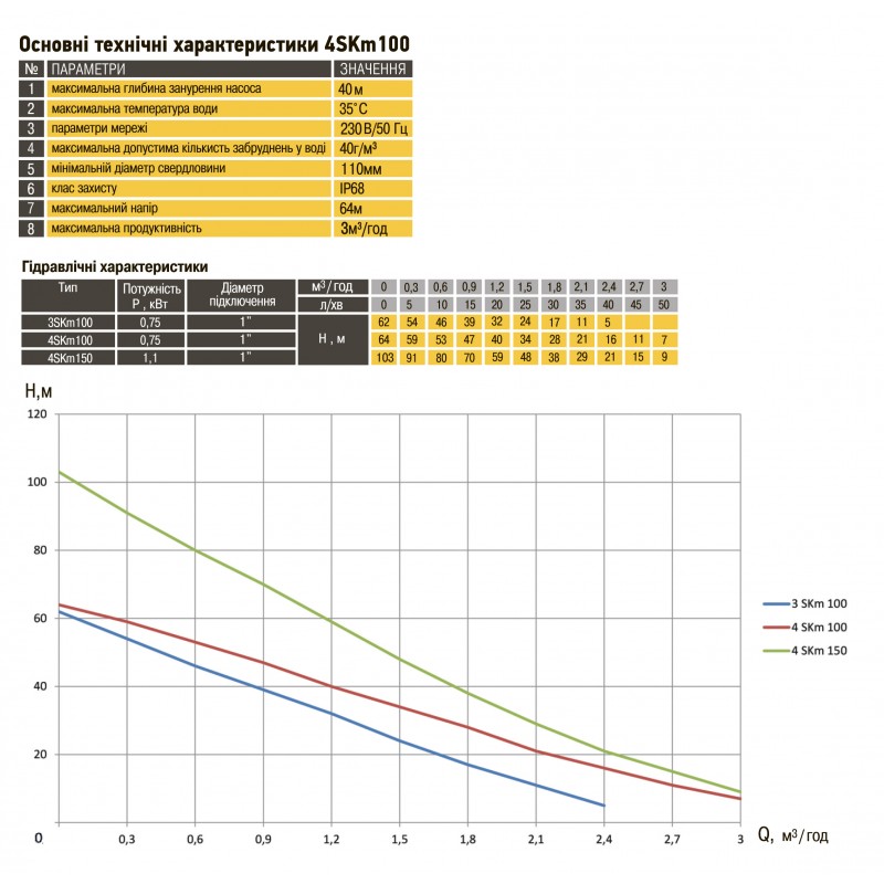 Технічні характеристики Загальні: Напруга - 230В + - 5% Частота - 50Гц Максимальна допустима кількість забруднень у воді - 100 г / м3 Максимальний діаметр - 96мм Максимальна температура води - 35С Максимальний напір - 60 м Максимальна продуктивність - 3,0 м3/год Максимально глибина занурення насоса - 20м