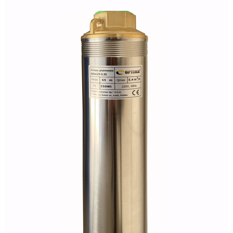 Загальні характеристики насоса: • Країна виробник: Польща • Вид: Відцентровий • Призначення: - Для колодязя, - Для свердловини, - Для крапельного поливу, - Для поливу городу, - Для підвищення тиску • Тип установки: Занурювальний • Форм-фактор: Вертикальний • Тип води: Для чистої води • Забір води: Зі свердловини • Продуктивність: 5400 л / год • Висота напору: 65 м • Частота струму: 50 Гц • Напруга мережі: 230 В • Глибина занурення: 100 м • Діаметр патрубка: 1 ½ ″ • Двигун: Однофазний, асинхронний, маслонаповнений • Потужність двигуна: 550 Вт • Кількість робочих коліс: 9 • Матеріал корпусу насоса: високоякісна сталь • Матеріал валу двигуна: Нержавіюча сталь • Колір: Нержавіюча сталь • Максимальна температура рідини, що перекачується: +35 ° С • Довжина кабелю: 35 м • Захист від перевантаження • Підвищена стійкість до піску-- максимальний вміст піску 2000 г / м3.
