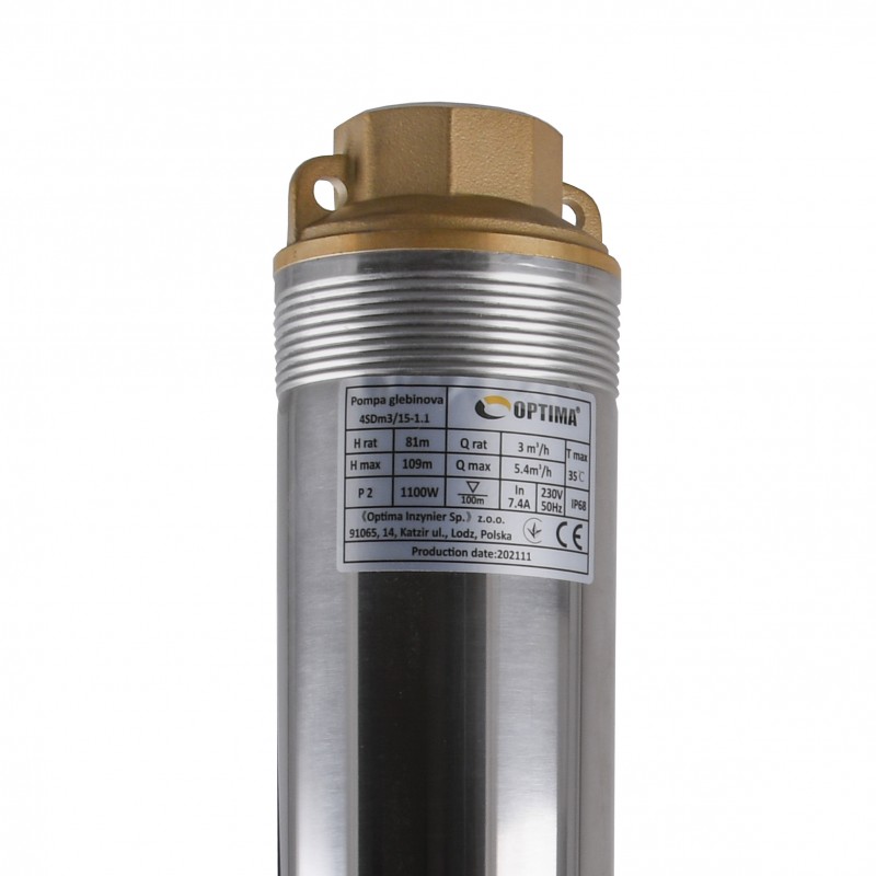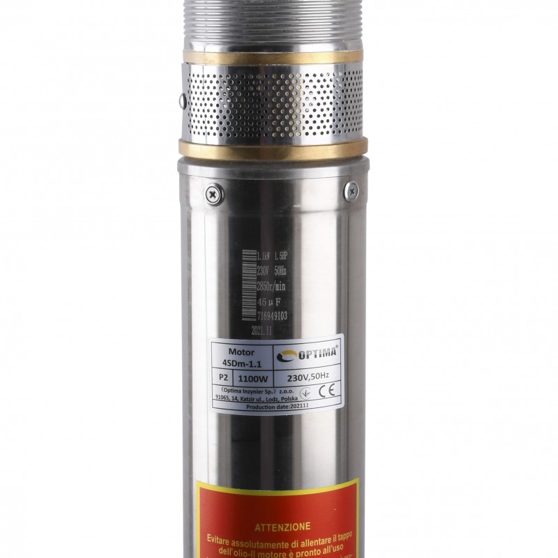 Конструктивні особливості: Насос OPTIMA 4SDm3 / 15 1.1 кВт 109м оснащений асинхронним однофазними двигуном з коротко замкнутим ротором і «плаваючим» робочим колесом, для реалізації підвищеної стійкості до піску. Насос комплектується вбудованим в пульт теплової захистом, а також конденсаторним блоком. Двигун заповнений спеціальним мінеральним маслом для ефективного охолодження (тепловіддачі в навколишнє середовище), а також для змащення й охолодження підшипників і механічного ущільнення. Масло сертифіковане для контакту з харчовими продуктами. У разі витоку запах, і колір води не змінюється, небезпеки забруднення немає. Вал і корпус електродвигуна виготовлений з нержавіючої сталі AISI 304. У нижній частині підшипник радіально - опорний, витримує осьові навантаження, у верхній частині двигуна - радіальний.