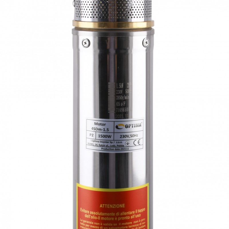 Конструктівні Особливості: Насос OPTIMA 4SDm3/20 1.5 кВт 145м оснащений асинхронним однофазним двигуном з коротко замкнутим ротором і «плаваючим» робочим колесом, для реалізації підвищеної стійкості до піску. Насос комплектується вбудованим у пульт тепловим захистом, а також конденсаторним блоком. Двигун заповнений спеціальним мінеральним маслом для ефективного охолодження (тепловіддачі в навколишнє середовище), а також для змащення та охолодження підшипників та механічного ущільнення. Олива сертифікована для контакту з харчовими продуктами. У разі витоку запах і колір води не змінюється, небезпеки забруднення немає. Вал та корпус електродвигуна виготовлений з нержавіючої сталі AISI 304. У нижній частині підшипник радіально-опорний, витримує осьові навантаження, у верхній частині двигуна – радіальний. Загальні характеристики насоса: