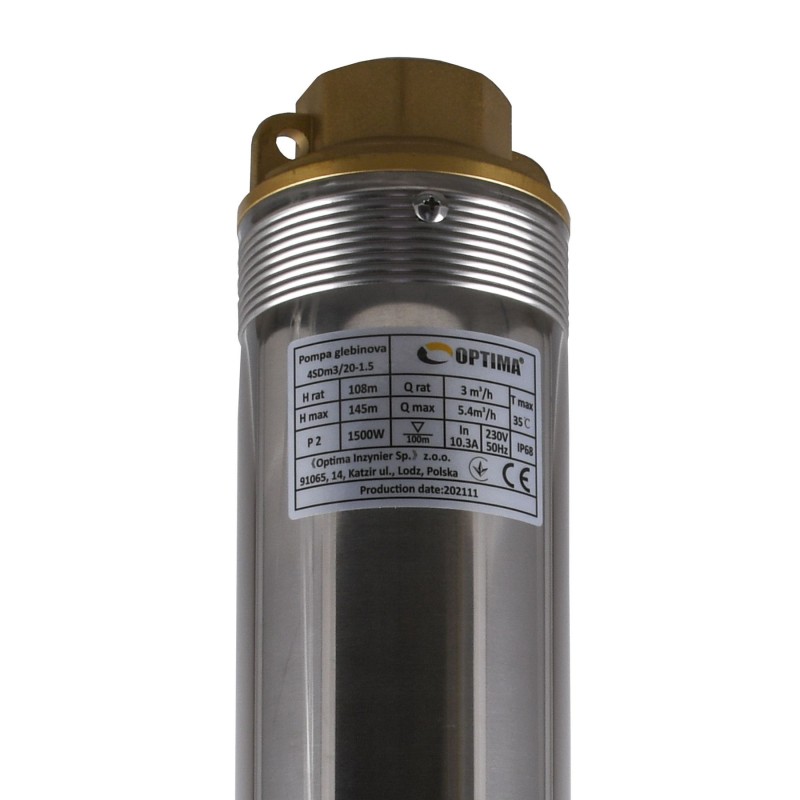 • Країна виробник: Польща • Вид: Відцентровий • Призначення: - Для колодязя, - Для свердловини, - Для крапельного поливу, - Для поливу городу, - Для підвищення тиску • Тип установки: Занурювальний • Форм-фактор: Вертикальний • Тип води: Для чистої води • Забір води: Зі свердловини • Продуктивність: 5400 л / год • Висота напору: 145 м • Частота струму: 50 Гц • Напруга мережі: 230 В • Глибина занурення: 100 м • Діаметр патрубка: 1 ½ ″ • Двигун: Однофазний, асинхронний, маслонаповнений • Потужність двигуна: 1500 Вт • Кількість робочих коліс: 20 • Матеріал корпусу насоса: високоякісна сталь • Матеріал валу двигуна: Нержавіюча сталь • Колір: Нержавіюча сталь • Максимальна температура рідини, що перекачується: +35 ° С • Довжина кабелю: 1,5 м • Захист від перевантаження • Підвищена стійкість до піску-- максимальний вміст піску 2000 г / м3.