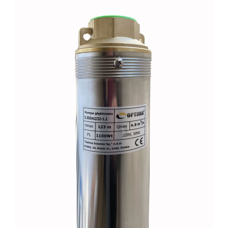 Конструктивні особливості: OPTIMA 3.5SDm2 / 22 1,1 кВт 123м оснащений асинхронним однофазними двигуном з коротко замкнутим ротором і «плаваючим» робочим колесом, для реалізації підвищеної стійкості до піску. Насос комплектується вбудованим в пульт теплової захистом, а також конденсаторним блоком. Двигун заповнений спеціальним мінеральним маслом для ефективного охолодження (тепловіддачі в навколишнє середовище), а також для змащення й охолодження підшипників і механічного ущільнення. Масло сертифіковане для контакту з харчовими продуктами. У разі витоку запах, і колір води не змінюється, небезпеки забруднення немає. Вал і корпус електродвигуна виготовлений з нержавіючої сталі AISI 304. У нижній частині підшипник радіально - опорний, витримує осьові навантаження, у верхній частині двигуна - радіальний.