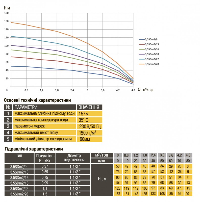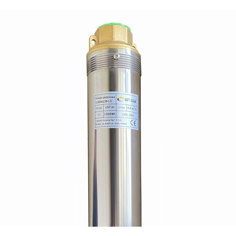 Конструктивні особливості: OPTIMA 3.5SDm2 / 28 1,5 кВт 157м оснащений асинхронним однофазними двигуном з коротко замкнутим ротором і «плаваючим» робочим колесом, для реалізації підвищеної стійкості до піску. Насос комплектується вбудованим в пульт теплової захистом, а також конденсаторним блоком. Двигун заповнений спеціальним мінеральним маслом для ефективного охолодження (тепловіддачі в навколишнє середовище), а також для змащення й охолодження підшипників і механічного ущільнення. Масло сертифіковане для контакту з харчовими продуктами. У разі витоку запах, і колір води не змінюється, небезпеки забруднення немає. Вал і корпус електродвигуна виготовлений з нержавіючої сталі AISI 304. У нижній частині підшипник радіально - опорний, витримує осьові навантаження, у верхній частині двигуна - радіальний.