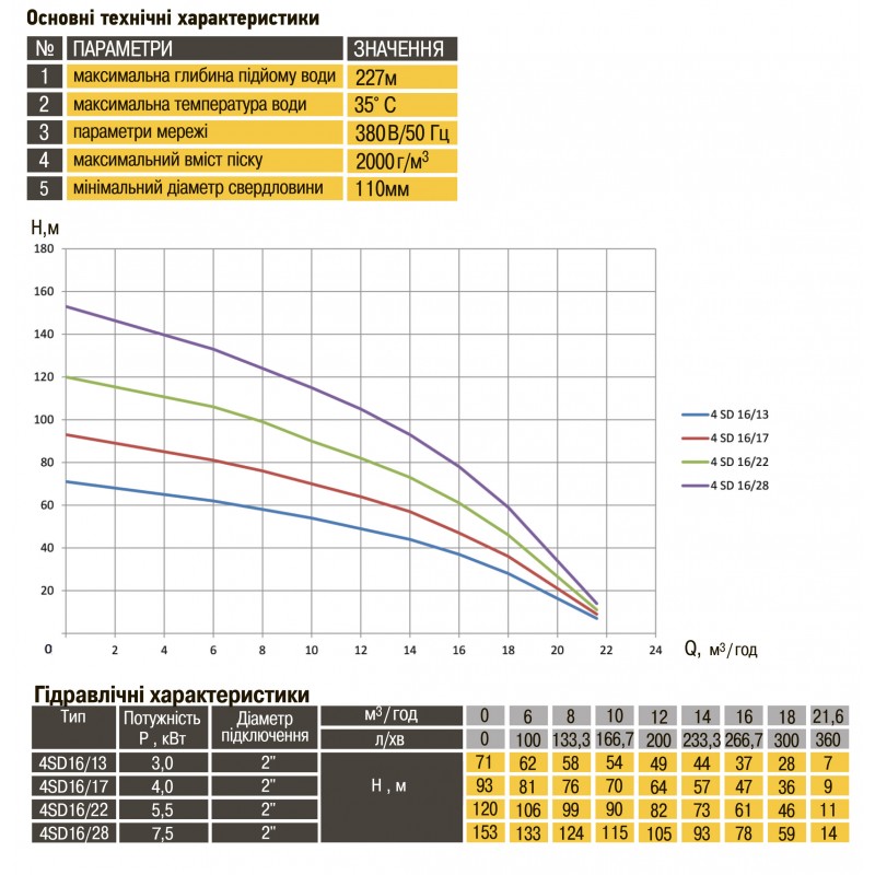 Технічні характеристики. Максимальна продуктивність до 21.6 м3 / год; Діаметр підключення - 2 ″ Максимальна глибина занурення - 100 метрів Максимальний напір - 120 м; Температура води, що перекачується до 35. ° С; Максимальний вміст піску 2000 г / м3.