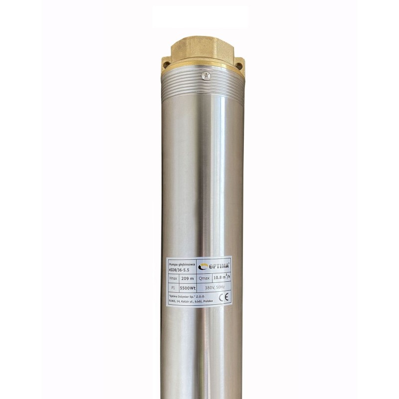 Конструктивні особливості: Насос OPTIMA 4SD8 / 36 5.5 кВт 209м 3-х фазний оснащений асинхронним однофазними двигуном з коротко замкнутим ротором і «плаваючим» робочим колесом, для реалізації підвищеної стійкості до піску. Двигун заповнений спеціальним мінеральним маслом для ефективного охолодження (тепловіддачі в навколишнє середовище), а також для змащення й охолодження підшипників і механічного ущільнення. Масло сертифіковане для контакту з харчовими продуктами. У разі витоку запах, і колір води не змінюється, небезпеки забруднення немає. Вал і корпус електродвигуна виготовлений з нержавіючої сталі AISI 304. У нижній частині підшипник радіально - опорний, витримує осьові навантаження, у верхній частині двигуна - радіальний.