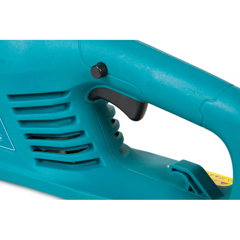 У ланцюгових пилах Hyundai з метою максимальної безпеки роботи крім аварійного гальма зупинки ланцюга передбачений механізм миттєвої зупинки приводу руху ланцюга при вимкенні кнопки включення пили.